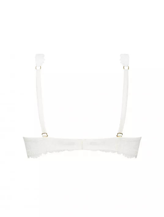 High plunging bonnet scalloped in embroidery and multi-thread guipure, lower bonnet in matching embroidered width. Lace basque enriched in the center with a tulle cutout, highlighted with a rhinestone gold jewel.