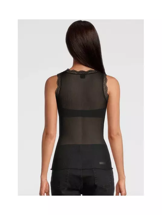 Top 100% soie à bretelles fines maille plissée avec dentelle leavers sur le décolleté.
