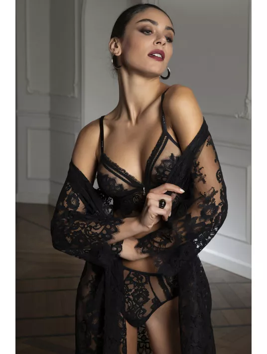 Déshabillé en dentelle festonnée en bas et aux manches, avec ceinture en satin de soie. 93% Polyamide, 6% Soie, 1% Elasthanne