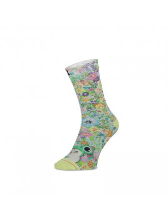 Ces chaussettes combinent un imprimé floral joyeux avec un joli chat habillé en grenouille. C'est comme une fête insolite pour vos pieds !
