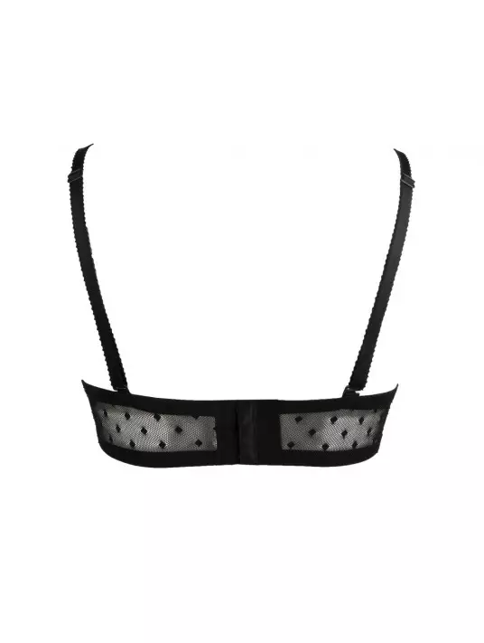 - Bandeau-shaped bra with half-covering cups (half-cup type) forming a horizontal strapless-like neckline superbly dressed with a graphic lace / fishnet yoke for assumed glamor. The perfect bra for a summer backless dress since it allows you to hide its straps for breathtaking shoulders.