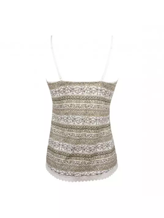 Printed mesh camisole. Insertion of a lace braid on the front neckline and lower body. Thin straps. Bow in the middle of the front.