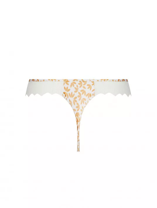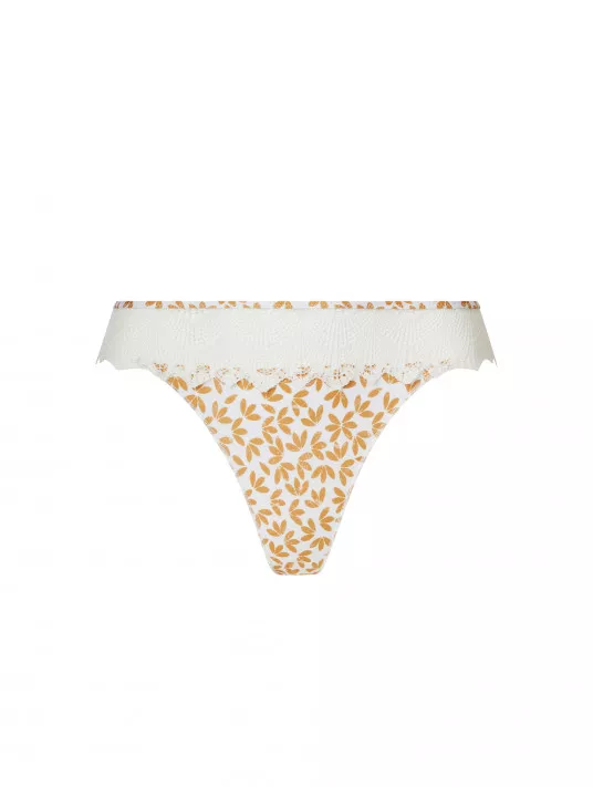 Thong in printed mesh and lace mix. Lace inlay in the middle of the front. The waist is highlighted by a printed saddle edge