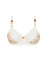 Wireless bra in printed mesh and lace. Cup cut-out for a good fit. Lined cups. Lace on the upper cup and in the middle between the throat. Departure printed straps at the front with fancy bow. Bow at the crotch.