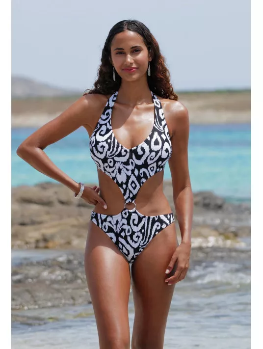 A trikini piece in printed mesh. Tied around the neck. Hook at the back. Ring that enriches the belly.