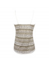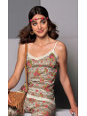 Printed mesh camisole. Insertion of a lace braid on the front neckline and lower body. Thin straps. Bow in the middle of the front.