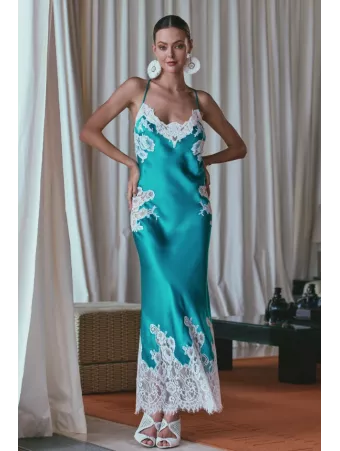 Made from pure silk, it offers exceptional softness and delicate fluidity. The V-neckline decorated with lace adds a touch of femininity and sensuality.