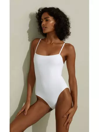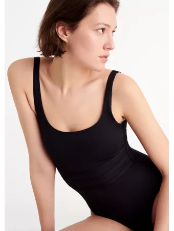 This one-piece swimsuit, available in the colors of the season, has wide straps and a rounded neckline.