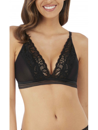 Printed viscose knit bralette. Cup necklines and backs are inlaid with lace braid. Bow at the crotch.