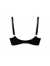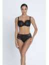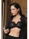 Bra fully lined to ensure quality support. High cups in Leavers lace, low cups and basque in wide lace. Straps in front of satin with braid of small flowers assembled by a satin bow. The top of the cleavage is in transparent tulle to highlight a satin bow and rhinestone baguette jewel.