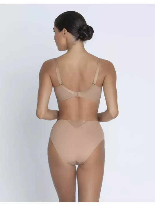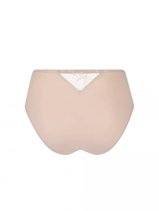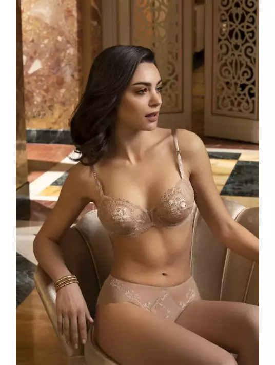 Déesse en Glam in its Nude color is the pleasure of a luxurious line, unique in its light and softness on the skin. The finesse of the Italian embroidery magnifies the lightness of the plant motifs. Refined cuts with sumptuous details ensure excellent support in all sizes. Refined cuts gently highlight feminine curves. Briefs offer a unique feeling of comfort