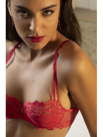 Front in scalloped and inlaid multi-thread embroidery on tulle playing a game of gradation of transparency and opacity.