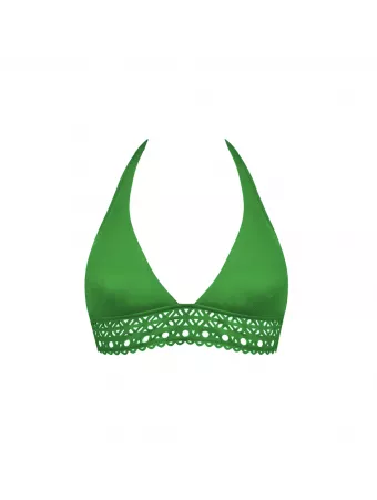Well-being bra with underwire - Full cup shape. High hat composed of a scalloped multi-thread embroidered braid, inlaid on printed and stripped tulle. The lower cup and basque are in printed tulle. The cleat is decorated with a rounded cutout at the bottom and a rhinestone jewel. The straps are enhanced by climbing guipure patterns.