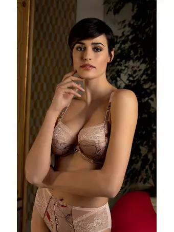 Well-being bra with underwire - Full cup shape. High hat composed of a scalloped multi-thread embroidered braid, inlaid on printed and stripped tulle. The lower cup and basque are in printed tulle. The cleat is decorated with a rounded cutout at the bottom and a rhinestone jewel. The straps are enhanced by climbing guipure patterns.
