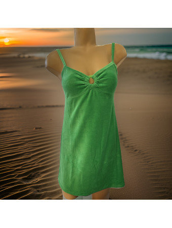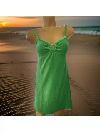 Short trapeze dress in terrycloth velvet with contrasting gold bias edging, square neckline.