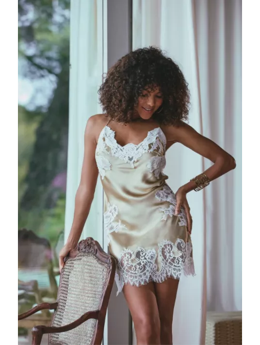 Its luxurious and fluid silk glides delicately over the skin, offering an exquisite feeling of softness and lightness for unparalleled comfort. Its neckline, enhanced by fine and delicate lace, brings a touch of femininity and refinement.