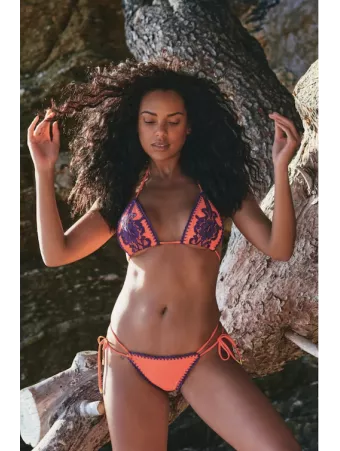 Crafted in soft, sculpting knit, this silhouette flatters with its slanted lines and neckline adorned with lace and a gold jewel. Its removable straps allow you to wear it crossed or tied as you wish. With its removable cups, it combines comfort and elegance, subtly enhancing your curves.