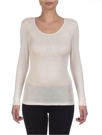 Long-sleeved top in fine ribbed knit, made of pure silk organza, embellished with a refined satin border.