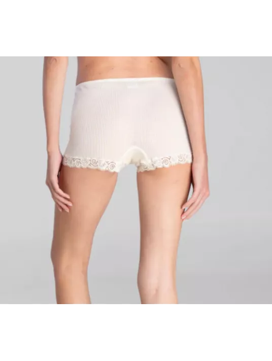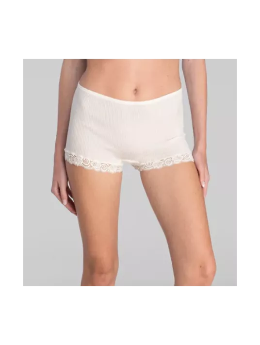 Mid-rise shorty made from a delicate blend of extra fine merino wool ribknit and high quality pure silk, decorated with elegant French Leavers lace, certified and numbered "Dentelle de Calais®", a symbol of femininity and refinement.