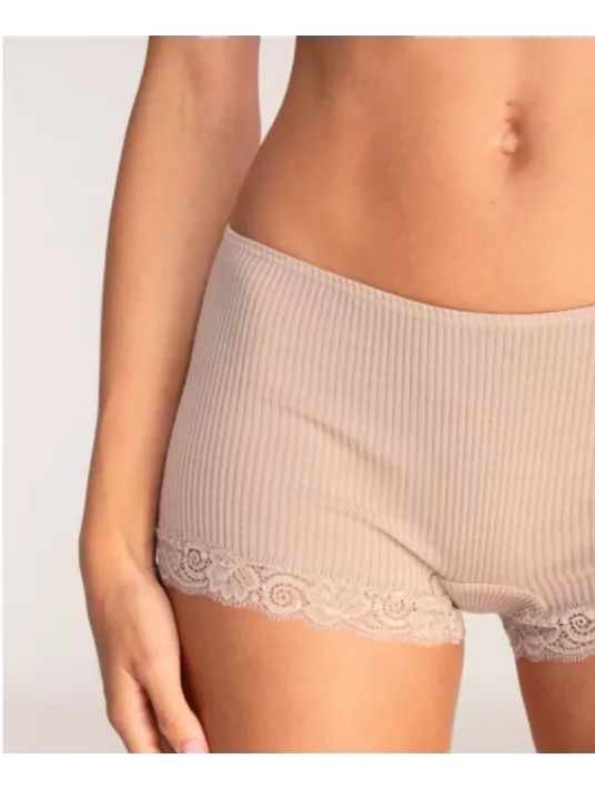Mid-rise shorty made from a delicate blend of extra fine merino wool ribknit and high quality pure silk, decorated with elegant French Leavers lace, certified and numbered "Dentelle de Calais®", a symbol of femininity and refinement.