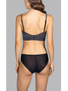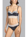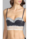 White polka dots on a black background for a graphic and contemporary look. White lace bands add freshness and lightness.