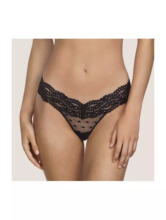 Tanga thong decorated with elastic Leavers lace all around the waist. Maximum adaptability and comfort with a look that could not be more feminine and sexy.