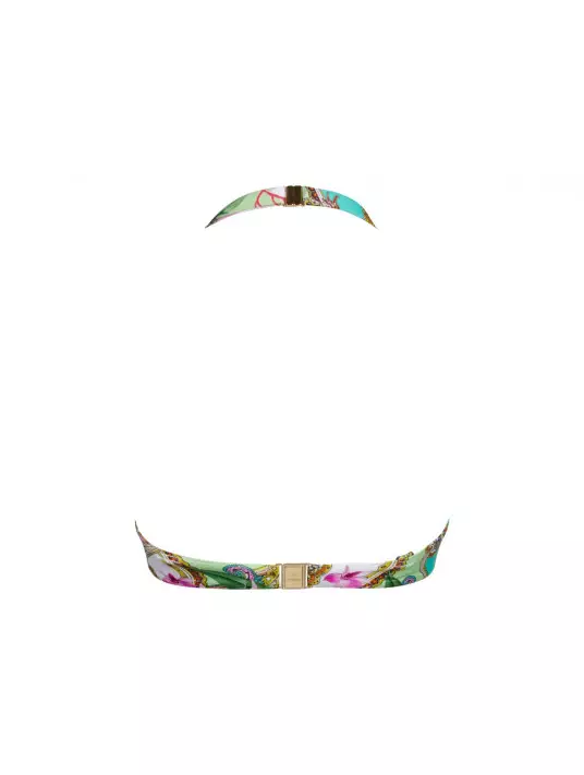 The elasticated back band ensures optimal comfort during swimming. Golden rings in suspender departures for a touch of seduction. Back closure by clip. Multiposition straps, expandable and adjustable.