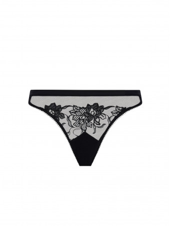 Slip fantaisie confortable au porter. Devant en satin de Soie et côtés en tulle brodé. Ce slip fantaisie offre un dos emboîtant réalisé en maille satinée.