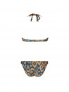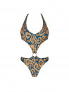 Une pièce trikini en maille imprimée. Noué tour de cou. Crochet au dos. Anneau qui sublime le ventre.