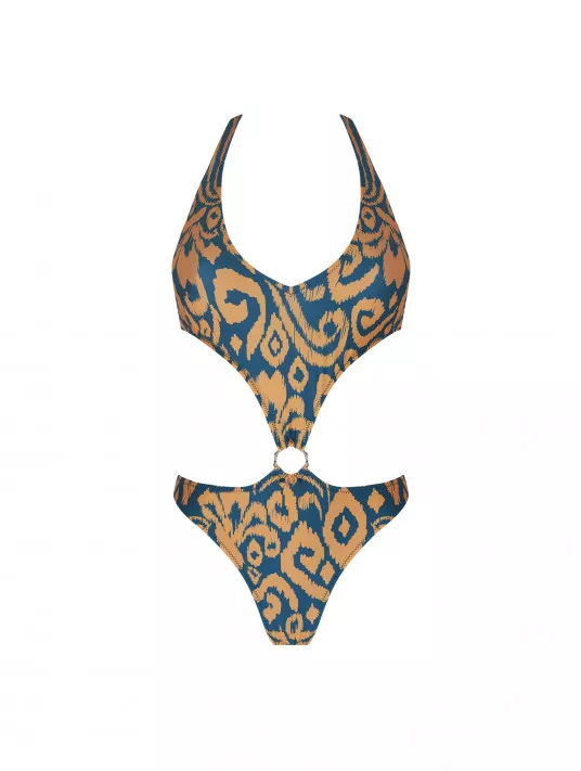 Une pièce trikini en maille imprimée. Noué tour de cou. Crochet au dos. Anneau qui sublime le ventre.