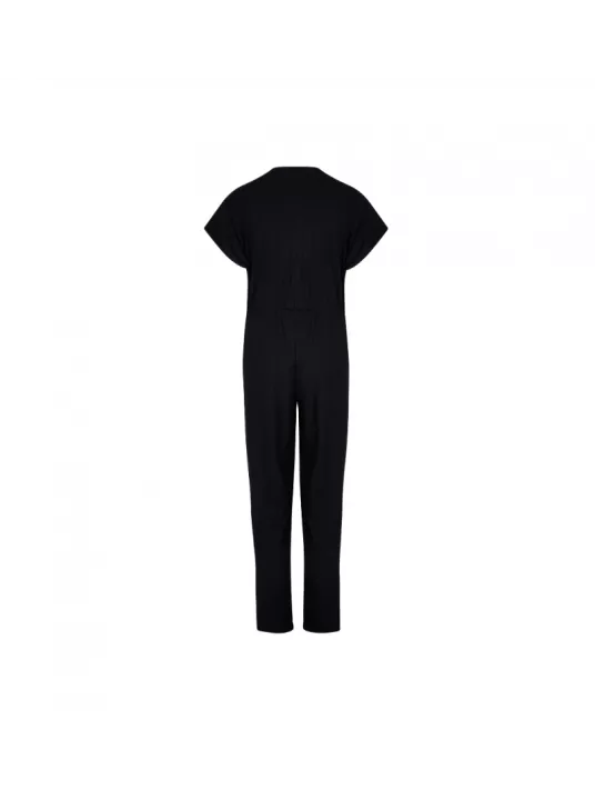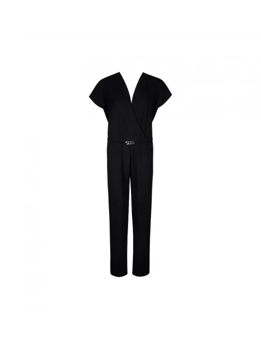 Combi pantalon en maille côtelée unie. Manches courtes. Devant effet cache-coeur avec décolleté V.