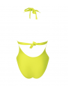 Il se noue élégamment autour du cou et dans le dos. Les bonnets triangulaires mettent en valeur la silhouette, tandis qu’un bijou orné de perles sublime l’entre-gorge.