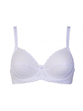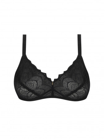 Soutien-gorge forme bandeau aux bonnets mi-couvrants (de type corbeille) formant un décolleté horizontal façon bustier superbement habillé d'un empiècement de dentelle/résille graphiques pour un glamour assumé. Le soutien-gorge parfait pour une robe estivale à dos nu puisqu'il vous permet de dissimuler ses bretelles pour des épaules à couper le souffle.