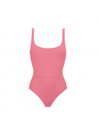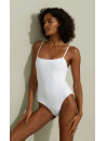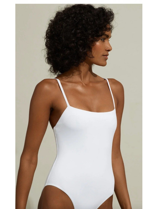 Plébiscité pour sa ligne pure, ce maillot une-pièce de type nageur s’ouvre sur un décolleté droit encadré par de fines bretelles.