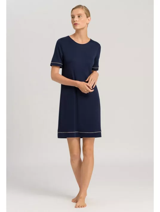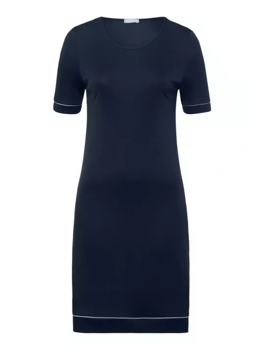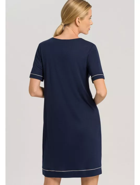 Le robe à manches courtes est bordée d'un passepoil contrasté sur les manches, la patte de boutonnage et l'ourlet. Découvrez cette pièce de nuit exceptionnelle.
