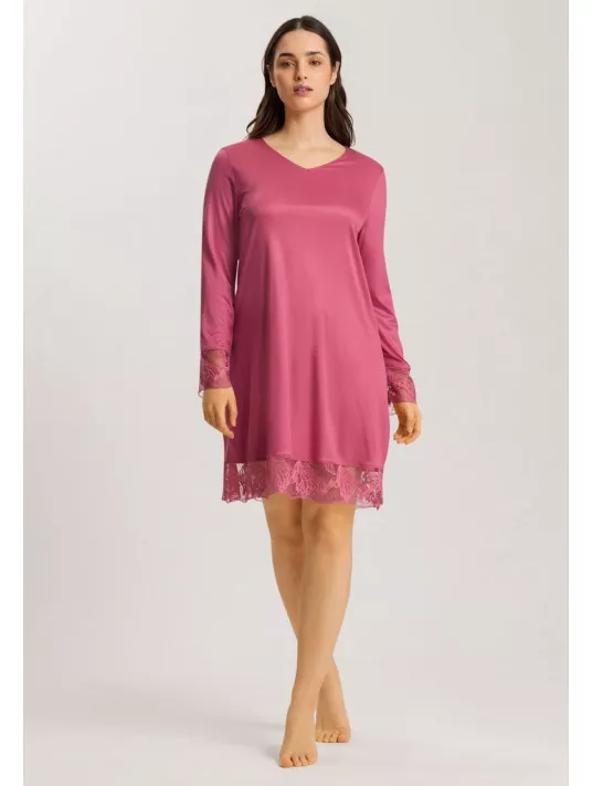 Chemise de nuit longue pour femme, manches longues, longueur 130 cm. Lingerie de nuit raffinée en interlock modal, un tissu fluide et doux issu du savoir-faire suisse. Les bordures délicatement ornées de dentelle subliment les ourlets et les manches. Le tissu est fabriqué en Suisse pour garantir une qualité exceptionnelle.