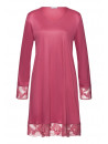 Chemise de nuit longue pour femme, manches longues, longueur 130 cm. Lingerie de nuit raffinée en interlock modal, un tissu fluide et doux issu du savoir-faire suisse. Les bordures délicatement ornées de dentelle subliment les ourlets et les manches. Le tissu est fabriqué en Suisse pour garantir une qualité exceptionnelle.