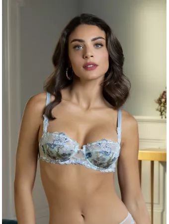 Haut bonnet festonné au décolleté en broderie multifils, avec incrustation de fleur en organza, bas bonnet en laize brodée coordonnée. Basque en tulle enrichie au centre d'une découpe de maille en V, d'incrustation dentelle Leavers aux côtés et de dentelle en pointe au départ bretelle dos. Le départ des bretelles devant est agrémenté d'un bijou chainette. Bijou strass en bas de l' entregorge.