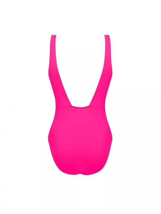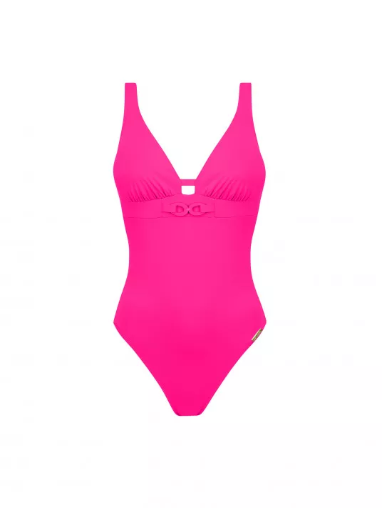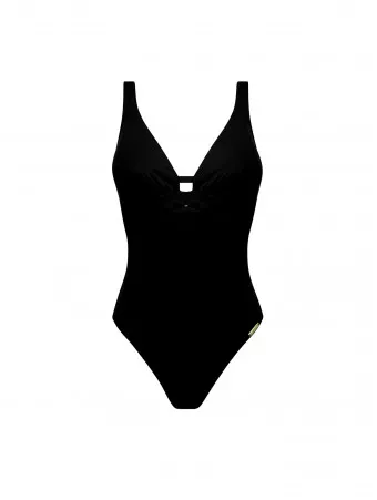 En détails chics, des anneaux textiles avec un rectangle doré, s’inspirent du symbole de l’infini. Douce et respirante, la matière protège efficacement la peau des UV. Certifiée Lycra® Beauty, elle galbe le corps avec un confort unique.