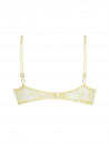 Collection frisson d'or de Lise Charmel : Forme triangle avec bonnets en broderie multifils festonnée au décolleté. Basque dentelle Leavers avec empiècement dos en laize brodée multifils. Double spaghettis agrémentés d'un anneau doré. Bijou or et strass à l' entregorge.