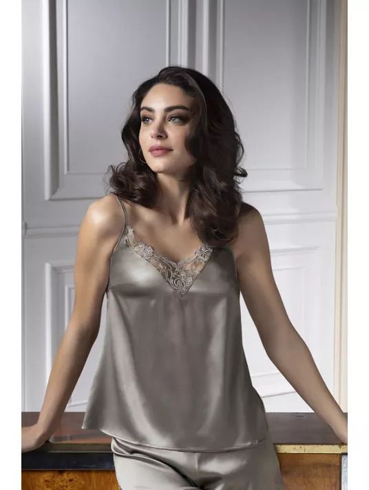 Caraco en satin de soie élastique, avec une découpe en V sur le décolleté devant qui dévoile une broderie multifils festonnée. Fines bretelles en satin de soie réglables dans le dos.
