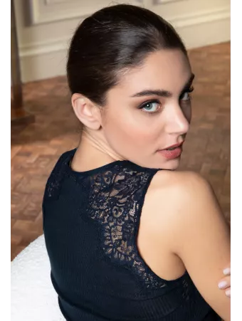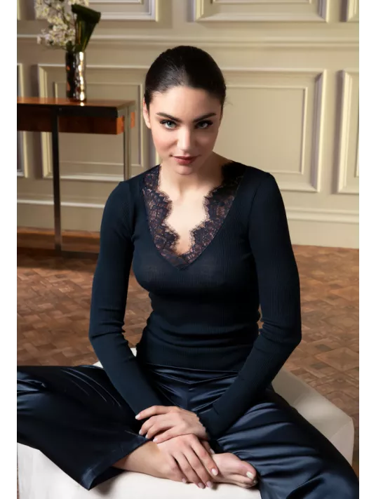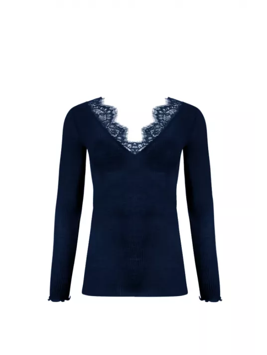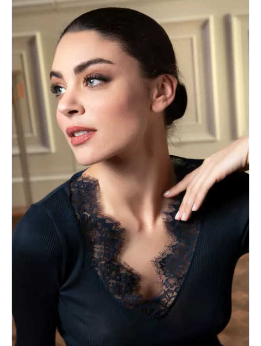 Tee-shirt manches longues en maille tubulaire avec incrustation dentelle sur le décolleté devant.