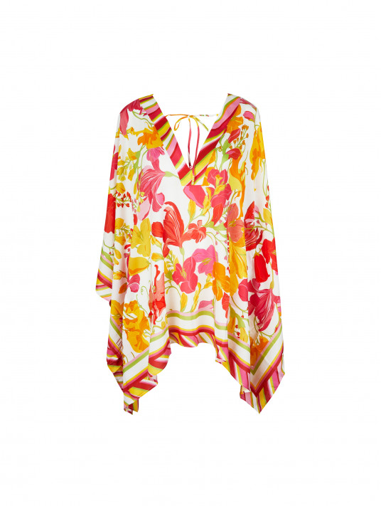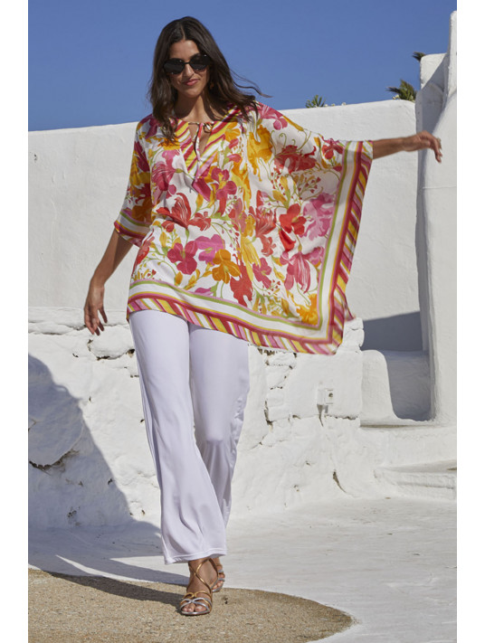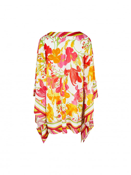 L’imprimé en motif placé dont le centre est le même que celui du beachwear avec le même rapport de dessin et l’extérieur reprend les finitions unies de certaines formes de maillots et de beachwear.