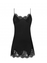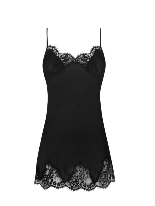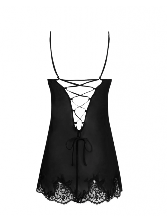 La babydoll, d’une longueur juste sous les fesses, se distingue par ses fines bretelles en satin de soie et son dos ouvert agrémenté d’un laçage, apportant une touche de féminité et de séduction. Les finitions en dentelle de Calais ornent le décolleté et le bas, ajoutant une note de raffinement.