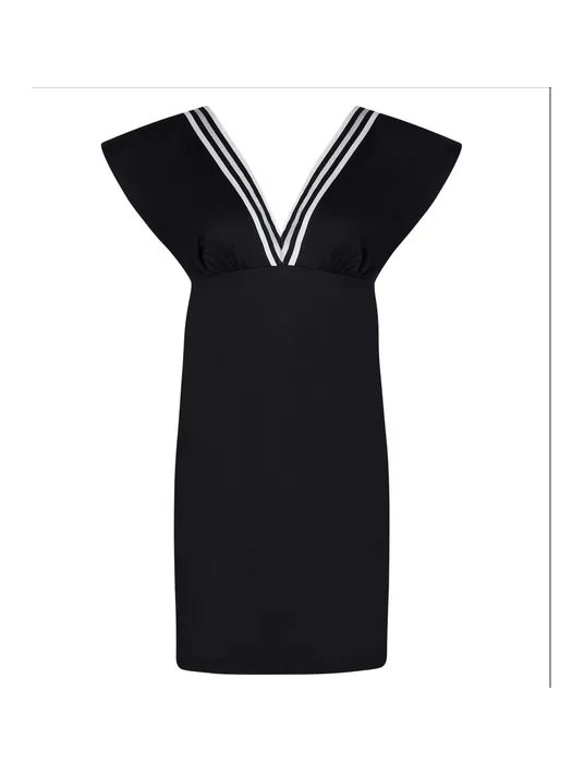 Robe en maille unie ornée d'un élastique graphique qui sublime les décolletés avant et arrière. Un lien au dos permet d'ajuster l'ouverture du décolleté.