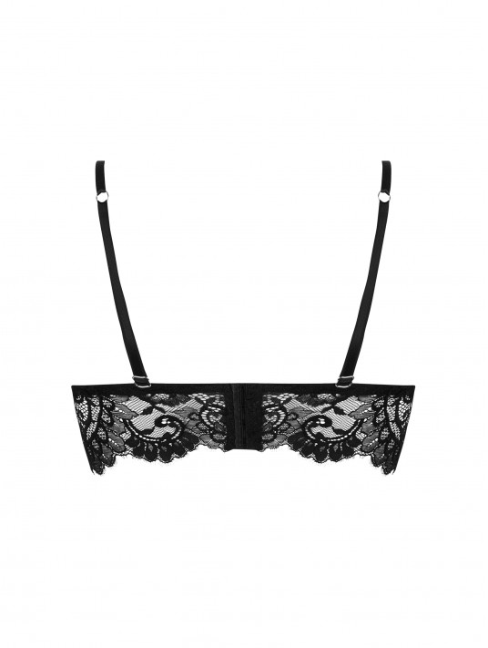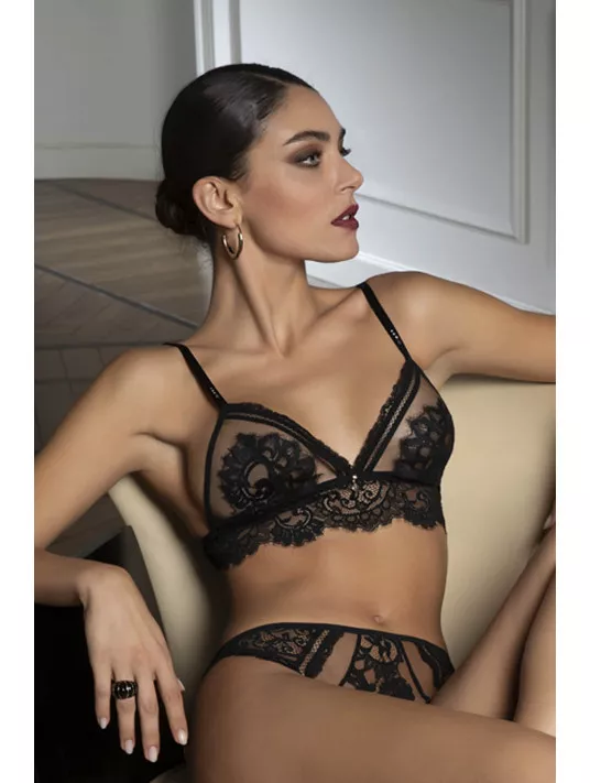 Bonnet triangle en tulle cristrallin incrusté de dentelle festonnée en son centre, et décolleté surligné d'un jour échelle surmonté d'un fin galon. Basque haute en dentelle festonnée, ornée d'un bijou doré strassé au milieu devant. Bretelles réhaussées de strass.