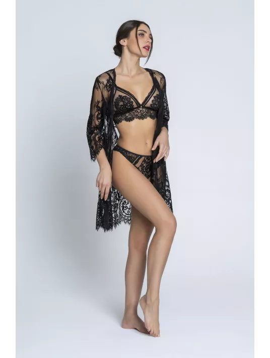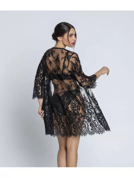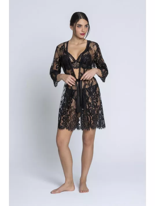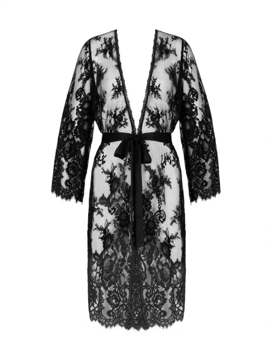 Déshabillé en dentelle festonnée en bas et aux manches, avec ceinture en satin de soie. 93% Polyamide, 6% Soie, 1% Elasthanne
