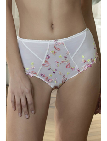 Le bas devant en soie est évasé, se fend pour laisser apparaitre la dentelle. Le bonnet en forme triangle sur le devant est surmonté de fines bretelles de soie quui se réglent au dos grâce à des anneaux et des réglettes dorées.