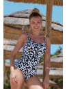 Une pièce sculptant avec un effet ventre plat en maille imprimée. Découpes verticales qui fusèlent la silhouette. Anneaux aux départ bretelles. Armatures pour un matien parfait de la poitrine