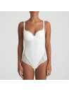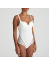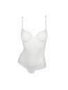 Les bonnets en mousse offrent à la poitrine un galbe rond et harmonieux. Le décolleté, souligné par un galon de broderie qui suit les courbes du buste, ajoute une touche de finesse.